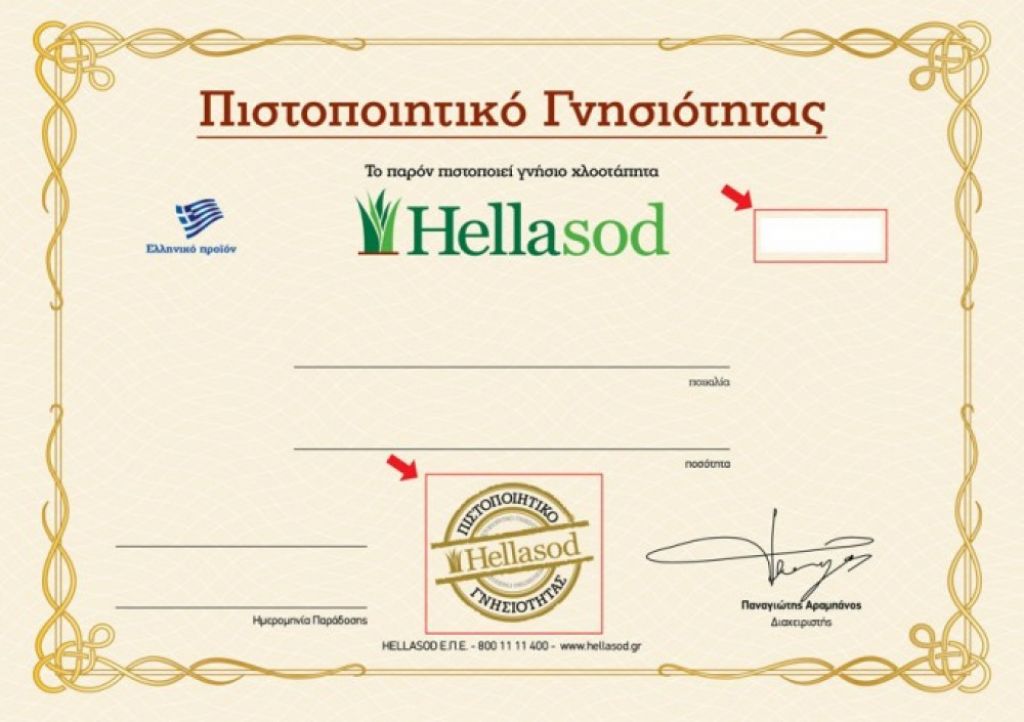 Το πιστοποιητικό γνησιότητας σας εξασφαλίζει ότι ο χλοοτάπητας που παραλαμβάνετε έχει τα υψηλά standards παραγωγής και ποιότητας, που μόνο η Hellasod μπορεί να προσφέρει.